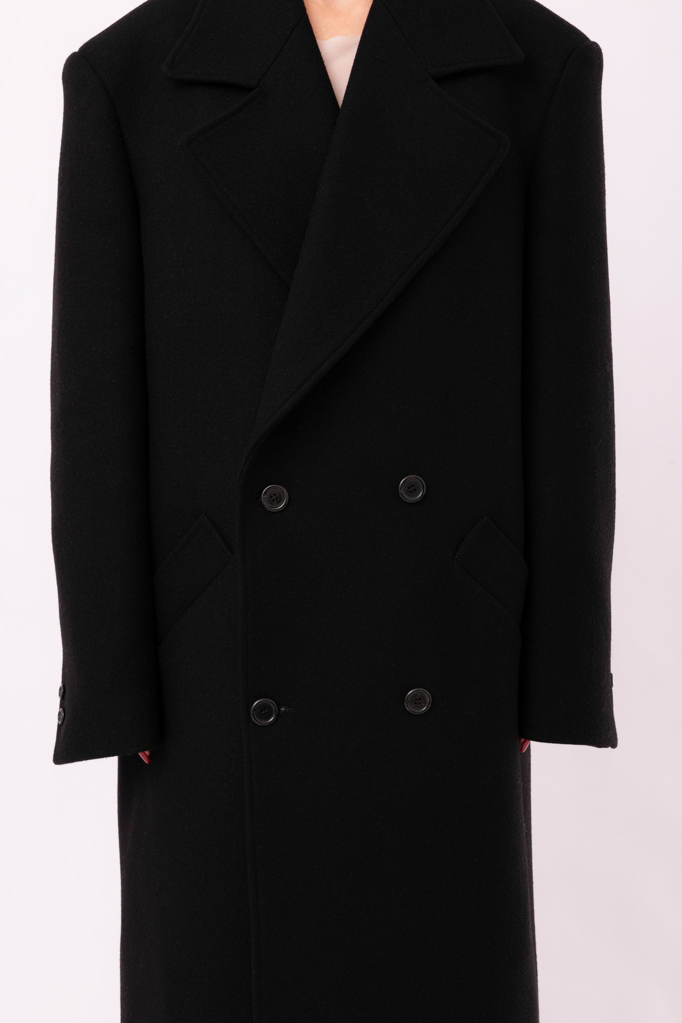 Questo cappotto oversize nero incarna l'essenza della sartoria minimalista. Realizzato in pura lana, presenta un taglio generoso con ampi revers e una chiusura doppio petto a quattro bottoni che definisce la silhouette. Le doppie tasche laterali e lo spacco manica con bottoni aggiungono dettagli costruttivi raffinati. Prodotto in edizione limitata in Puglia, garantisce qualità artigianale e longevità. Disponibile in taglie SM (150 cm) e LXL (153 cm). Nelle prime due foto è indossata una taglia L-XL, nelle altre due la taglia indossata dai modelli è S-M
