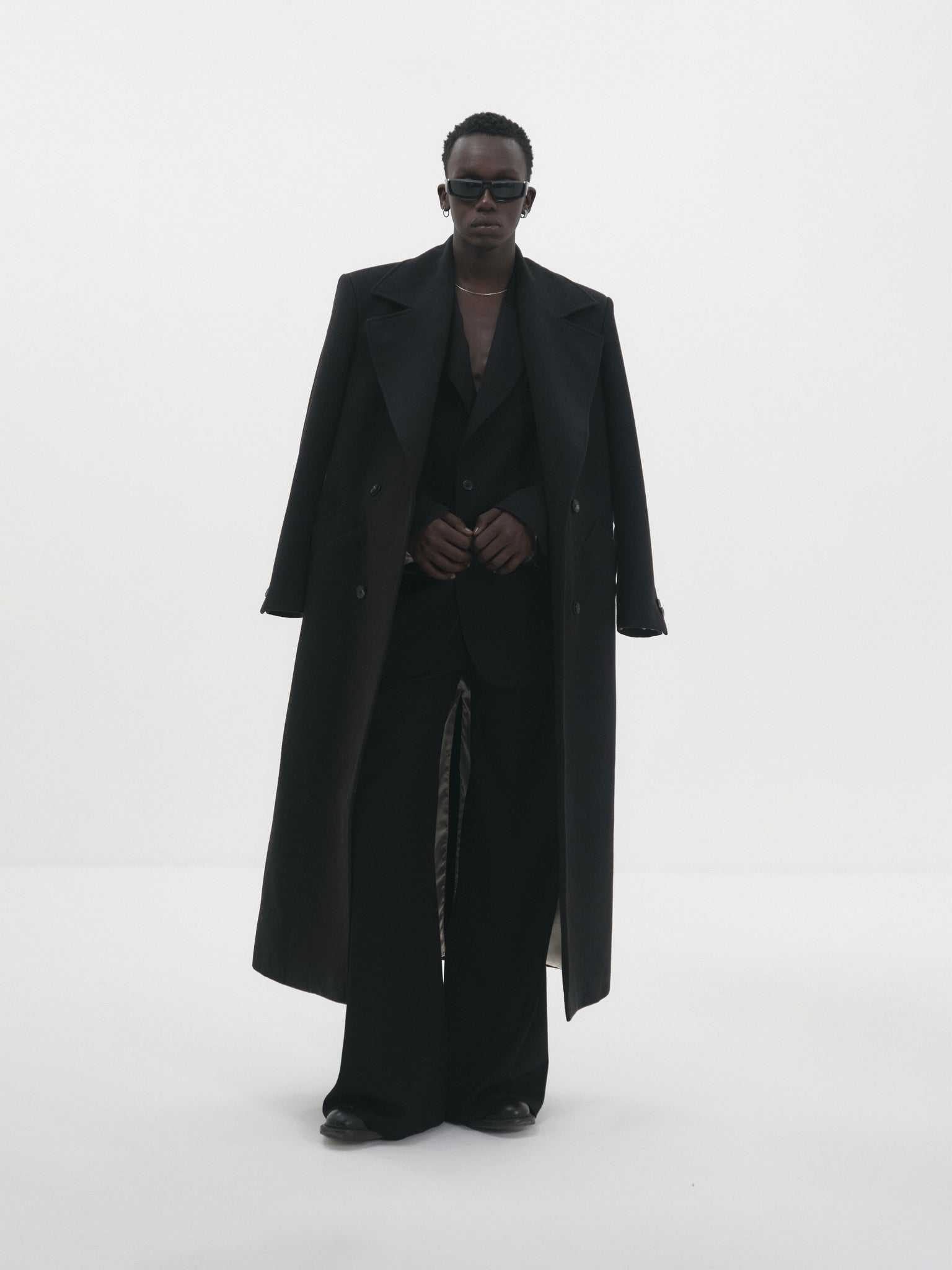 Cappotto oversize in pura lana pettinata, revers ampio, chiusura doppio petto a quattro bottoni, doppia tasca, spacco manica con due bottoni. Lunghezza capo TG SM 1,50 e TG LXL 1.53